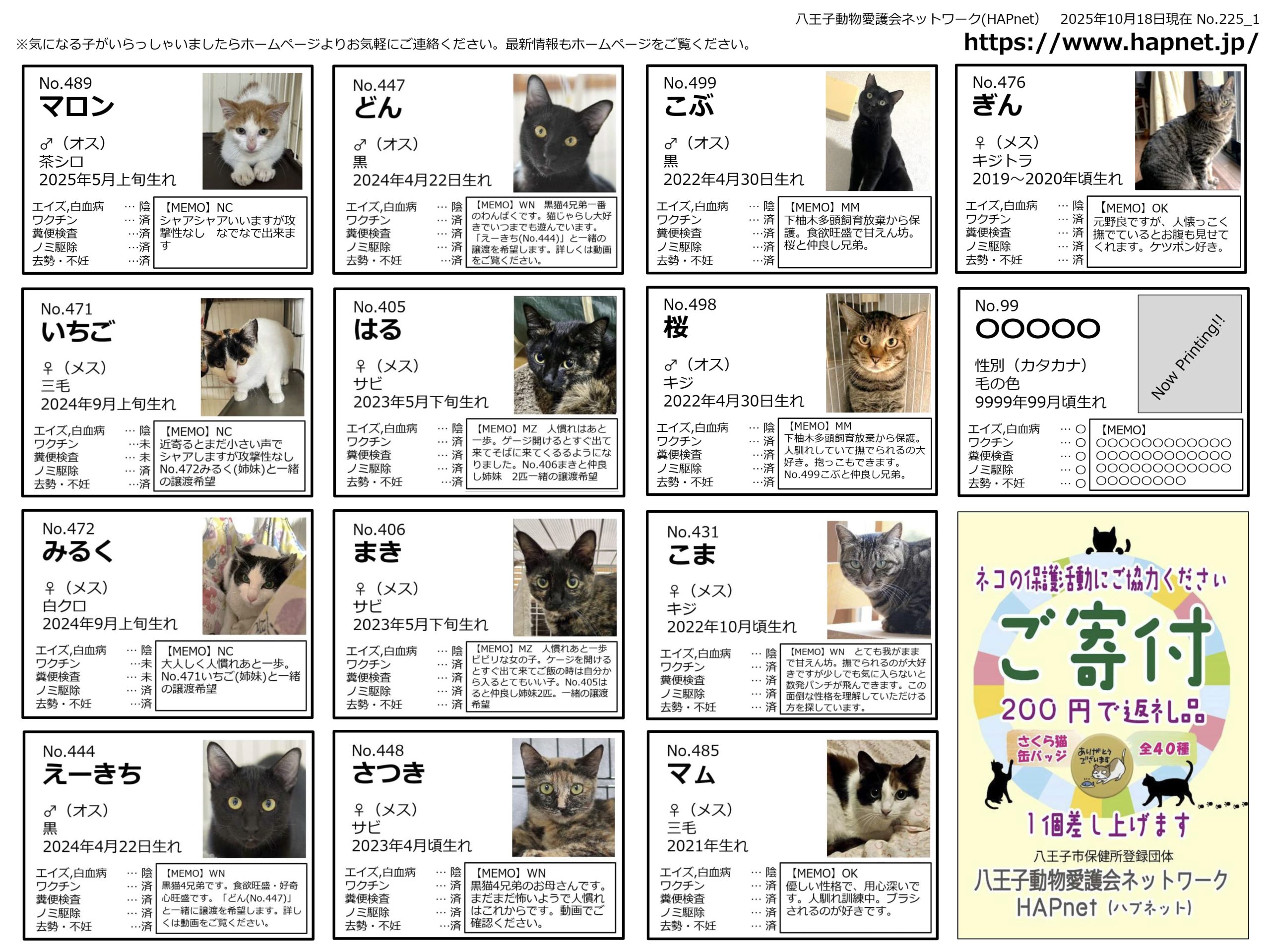新しい家族を探している子 譲渡猫情報一覧 Author webmaster Date 2025年10月18日 譲渡猫一覧 (2025/10/18 更新) 譲渡猫一覧のPDF版はこちら 譲渡のお申込み手順 譲渡の相談およびお申し込みは次の手順でお願いします。①次のフォームより譲渡希望を申し込む譲渡希望お問い合わせフォーム ②公式L