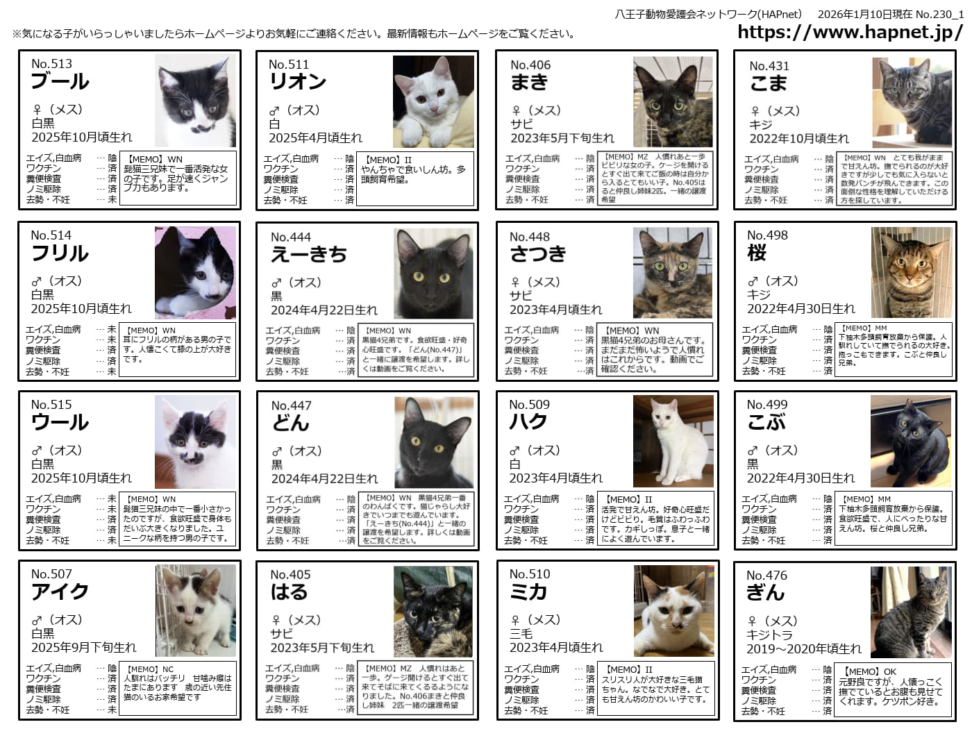 新しい家族を探している子 譲渡猫情報一覧 Author webmaster Date 2026年1月10日 譲渡猫一覧 (2026/1/10 更新) 譲渡猫一覧のPDF版はこちら 譲渡のお申込み手順 譲渡の相談およびお申し込みは次の手順でお願いします。①次のフォームより譲渡希望を申し込む譲渡希望お問い合わせフォーム ②公式LI