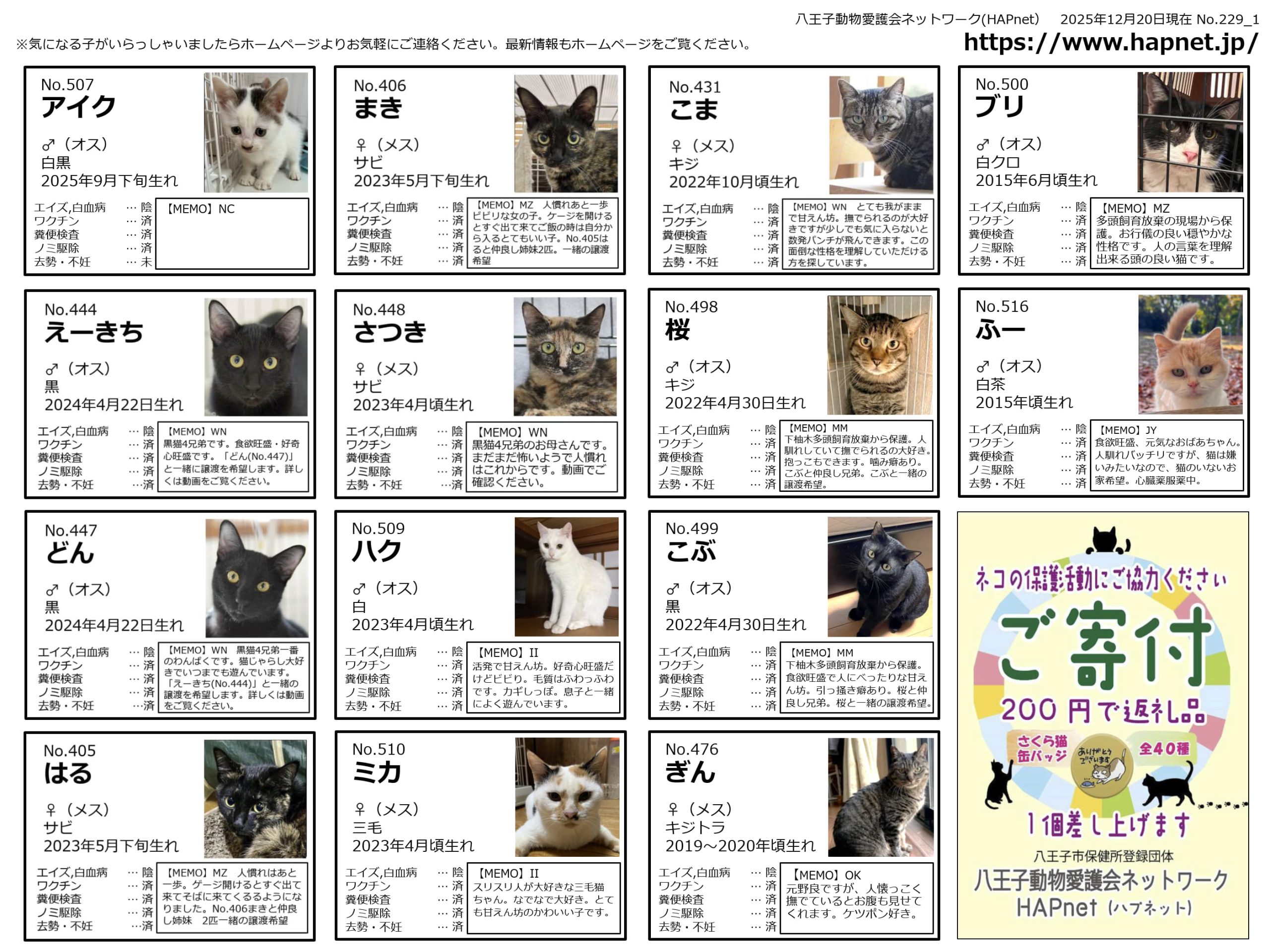 新しい家族を探している子 譲渡猫情報一覧 Author webmaster Date 2025年12月20日 譲渡猫一覧 (2025/12/20 更新) 譲渡猫一覧のPDF版はこちら 譲渡のお申込み手順 譲渡の相談およびお申し込みは次の手順でお願いします。①次のフォームより譲渡希望を申し込む譲渡希望お問い合わせフォーム ②公式L